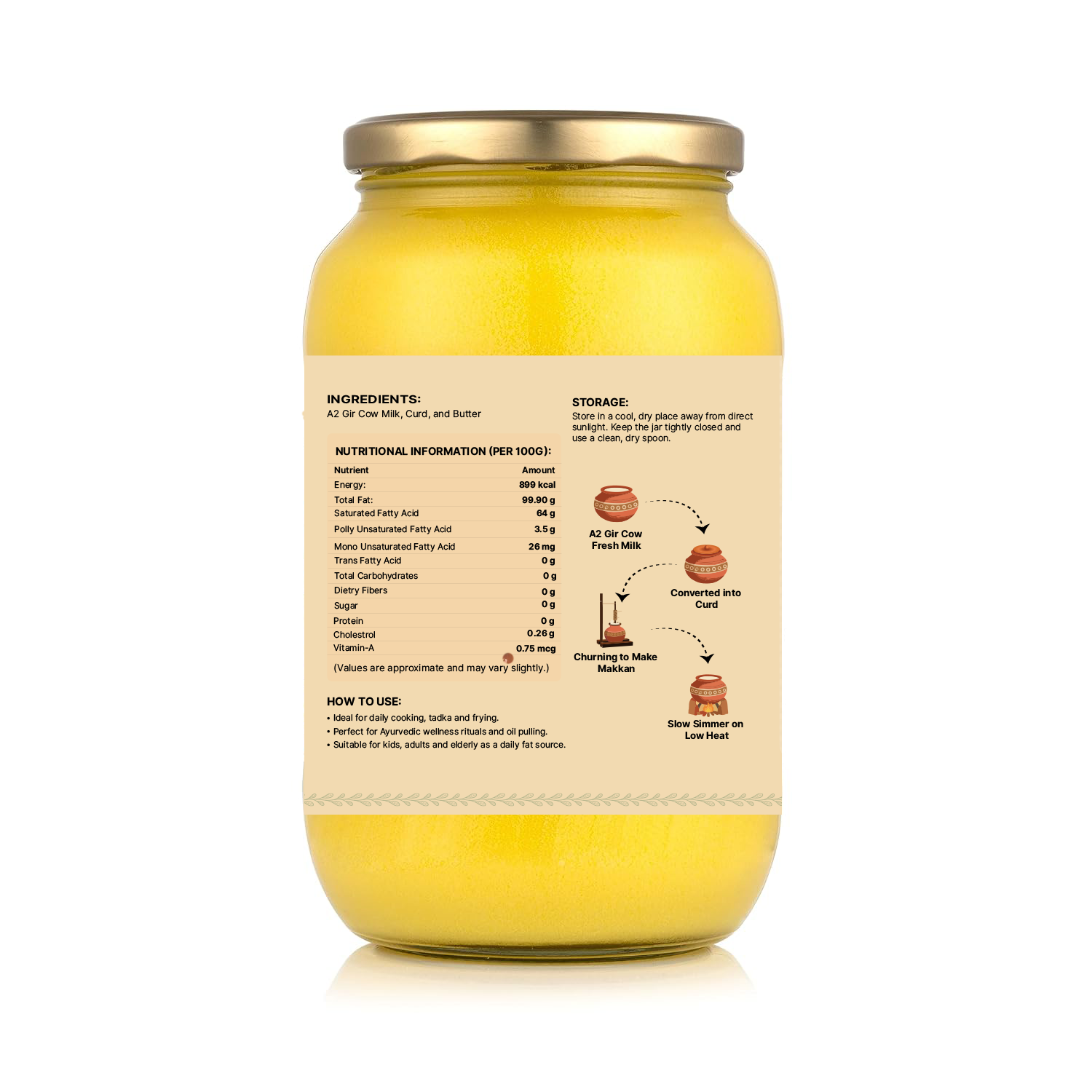 Store in a cool, dry place away from direct sunlight. Do not refrigerate. Ghee is naturally stable at room temperature.